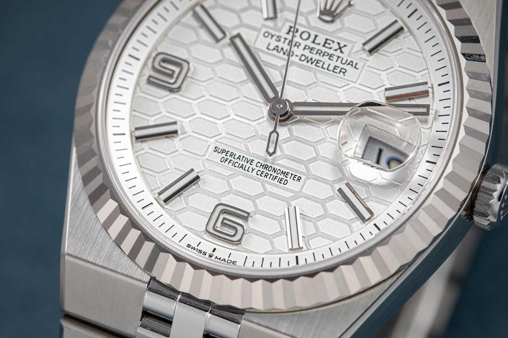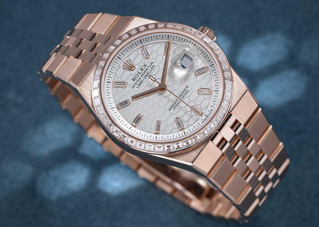 The dials on all versions invariably feature a honeycomb motif executed with femtosecond lasers. This technique was previously used in Datejust 31 and 36 models, which featured patterned dials such as floral, palm and fluted motifs. These dials combine traditional sunray finish with femtosecond laser engraving to create matte or grained surfaces. The process involves two distinct decorating techniques — surface structuring followed by a deep engraving with a femtosecond laser.