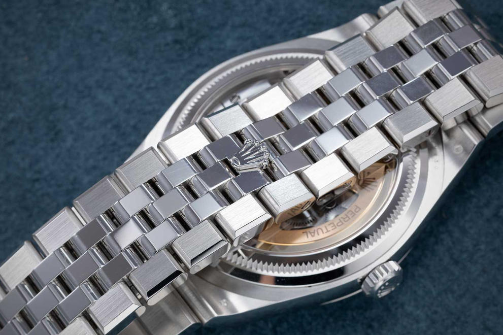 Unlike the original, all the links in this version are flat, giving the bracelet a cleaner, more architectural profile. The polished centre links are subtly raised above the adjacent brushed outer links, creating a sense of depth and contrast. Both the case middle and the outer bracelet links are highlighted with polished bevels. According to Rolex, achieving this seamless flow required the development of a dedicated, highly exacting manufacturing process, which differs entirely from the techniques used for its other bracelets.