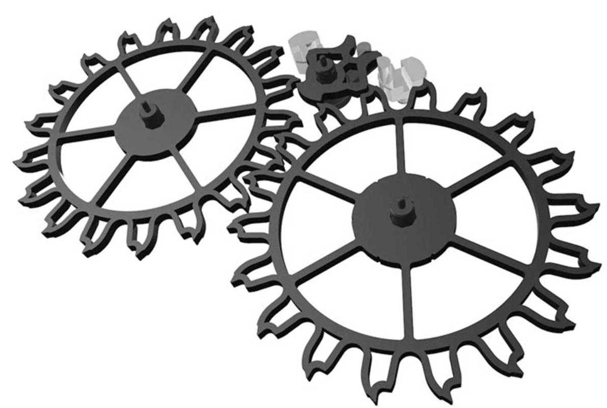 The escape wheels are identical and symmetrical, allowing inversion during assembly.