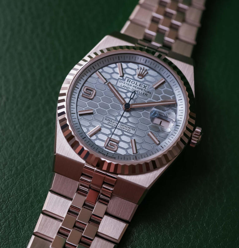 Here, the Land-Dweller also has some stories to tell. It’s no surprise anymore to say that Rolex has ramped up its dial-making expertise in recent years, bringing smoked dials, laser-etched patterns, solid ceramic dials, but also more traditional techniques such as stone dials, guilloché patterns or even cloisonné enamel. And although the LD doesn’t feature such métiers d’art techniques, the dial involves intricate processes.
