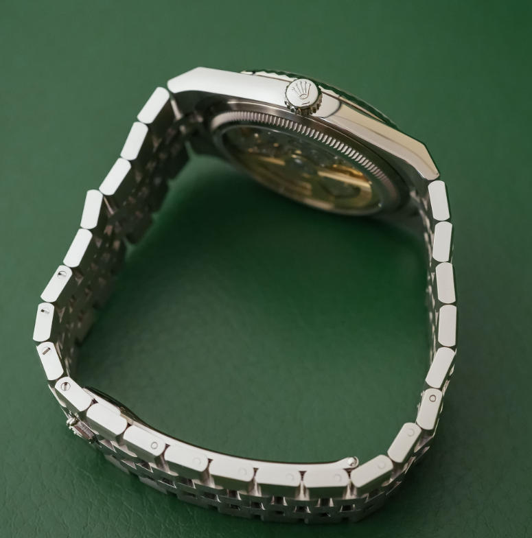 The bracelet is closed by an elegant concealed folding Crownclasp, which contributes to the consistency of the design. The clasp is entirely invisible, except for the raised coronet used to unlock it. While the visual appeal is undeniable, there is a flip side to the coin, as there is no micro-adjustment system on the clasp of the Flat Jubilee bracelet, which is not different from the President bracelet of a Day-Date. That being said, the links are short and should ensure a relatively precise length adjustment. And as a more subjective note, the overall execution of the bracelet and clasp is quite impressive, and marks a step up in refinement compared to a standard Jubilee bracelet.