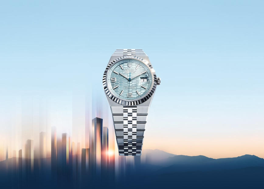 The dial of the perfect clone Rolex Land-Dweller watches is where art meets precision. Here, the brand’s distinctive honeycomb motif—historically associated with Rolex dials from the mid-20th century—has been reinterpreted through modern technique. The honeycomb structure is cut with a femtosecond laser and etched with hairline grooves, creating a geometric surface alive with depth and texture. On the intense white dial of the white Rolesor and Everose gold versions, the motif is given a satin finish, its crisp geometry softened by light, while on the ice blue face of the platinum iteration, a subtle sunray finish adds vibrancy and dimensionality.
